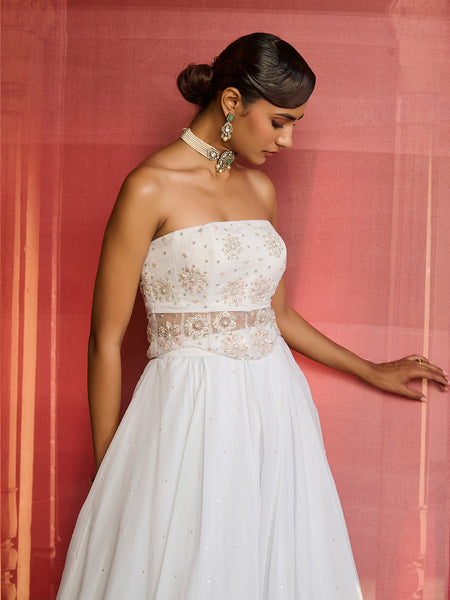 - Completely hand embroidered organza corset blouse with detailed floral motifs all over