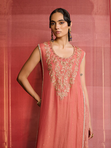 - Foil georgette kurta with heavy embroidery around the neck and hand embroidered border