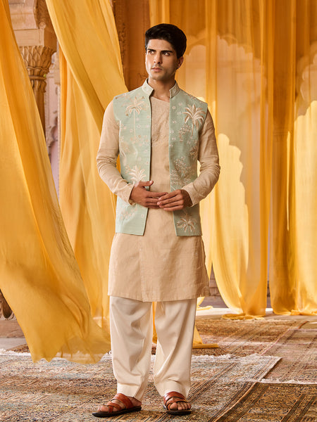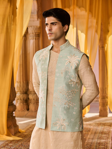 - Mint Green front open nehru jacket in pure raw silk with placement embroidery